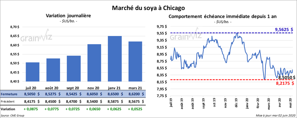 Les contrats de soya US ont fini la journée en hausse de 7 ¾ à 10 cents. Celui juillet 20 a progressé le plus. Les contrats de tourteau de soya US ont également terminé dans le vert entre 60 cents et 1,30 $/tonne. L’huile de soya US a clôturé avec des gains de 38 points.
