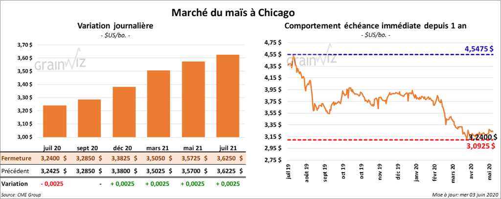 Les contrats de maïs US de la nouvelle récolte ont terminé la session en hausse de ¼ cent. À la fermeture du marché, ceux de l’ancienne récolte étaient demeurés stables ou en baisse de ¼ cent.
