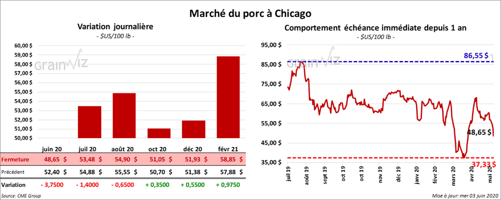 - Le 1er juin dernier, le CME Lean Hog Index était en baisse de 73 cents à 59,23 $.