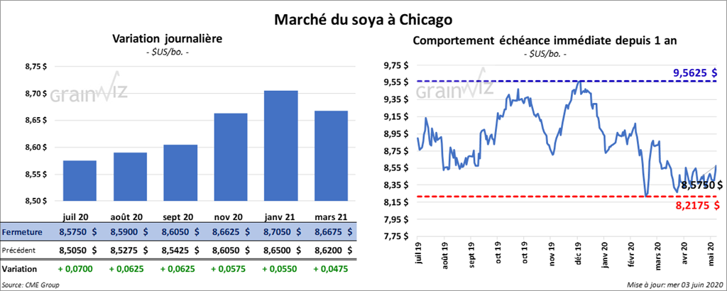À la clôture du marché, les contrats de soya US étaient en hausse de 4 ¾ à 7 cents. Les contrats de tourteau de soya US ont également fini dans le vert par 2,60 et 2,70 $/tonne. L’huile de soya US a fait l’inverse en terminant en baisse de 7 à 8 points.