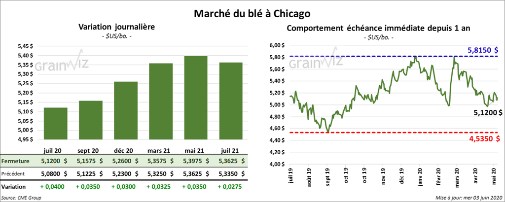 Les contrats de blé US ont fini la séance avec des gains. Ils ont progressé le plus à Kansas. À la fermeture, les contrats de blé dur rouge d’hiver avaient rebondi de 1,3 % à 1,6 % ou à plus de 7 cents. Les contrats de blé tendre rouge d’hiver ont terminé en hausse de 3 à 4 cents. À Minneapolis, les contrats de blé ont fini dans le vert par 3 ¼ à 3 ¾ cents.