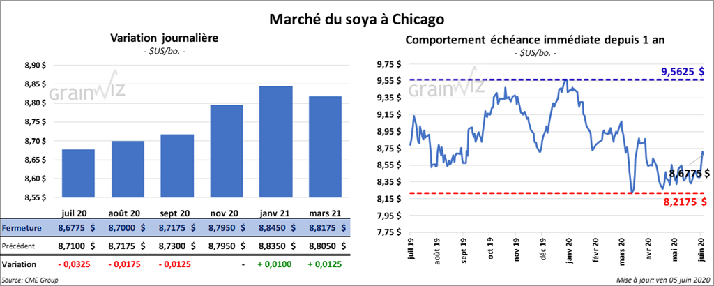 Sur la semaine, le contrat de soya US juillet 20 a progressé à 3,3 %. Aujourd’hui, les contrats de soya US ont clôturé au neutre ou en hausse de 3 cents, mais c’était surtout le contrat de janvier 20 qui a gagné le plus. Les contrats de tourteau de soya US ont fini la journée en baisse de 40 à 70 cents/tonne. L’huile de soya US a clôturé en hausse de 32 points. Sur la semaine, le contrat juillet 20 a progressé de 88 points.