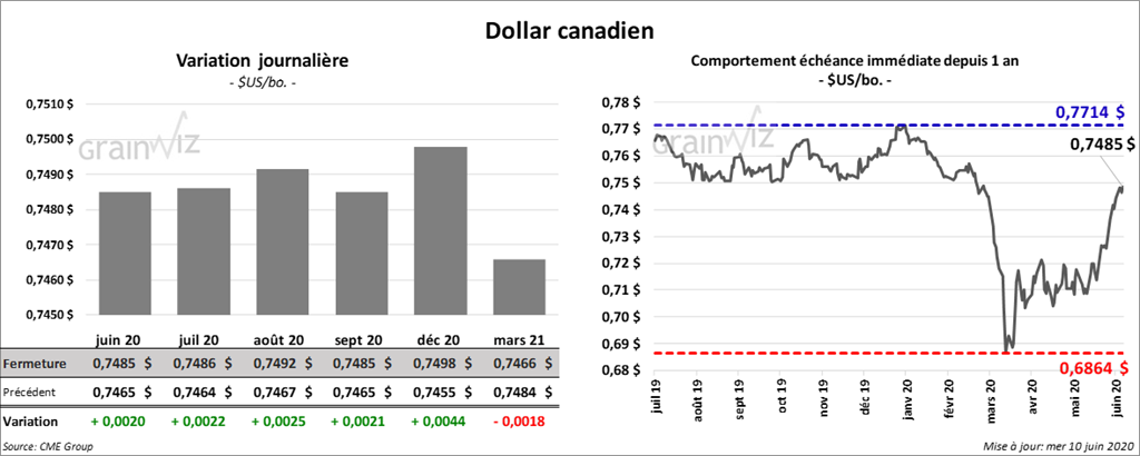 Les contrats de soya US juillet 20 jusqu’à novembre 20 ont clôturé avec des gains. Par contre, le contrat janvier 21 a terminé au neutre et celui mai 21 a terminé la journée en baisse de 2 cents.