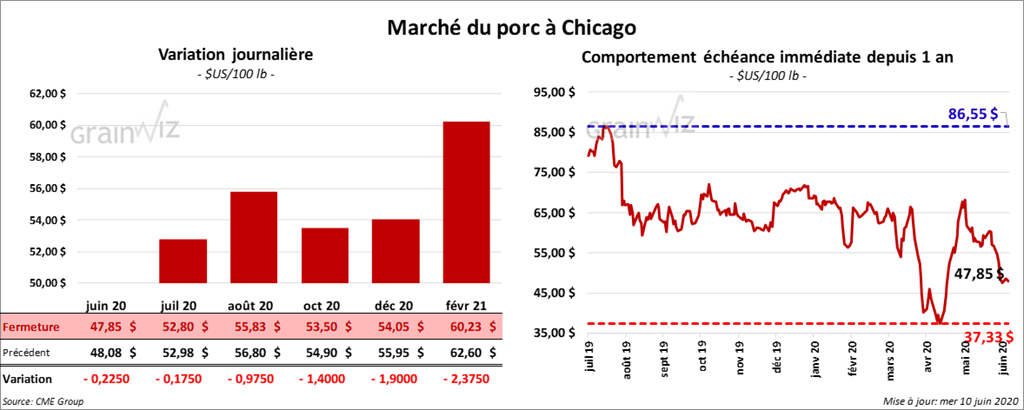 - Le 8 juin dernier, le CME Lean Hog Index était en baisse de 16 cents à 51,77 $.