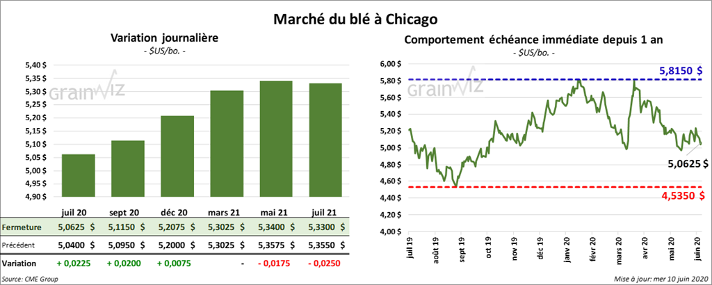- Les analystes prévoient un rapport du WASDE qui indique une hausse des inventaires de fin d’année de blé 2019/2020 de 1,6 million de boisseaux à 979,6 millions de boisseaux. Par contre, ceux de la nouvelle récolte pourraient diminuer de 8,5 millions de boisseaux avec une production en baisse de 11 millions de boisseaux.