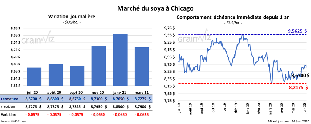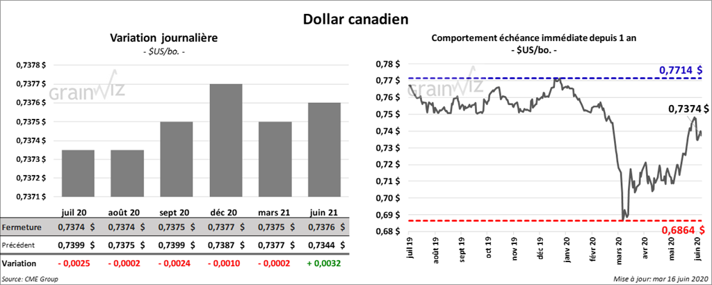 Les contrats de blé US ont terminé la session en baisse. Ceux de blé tendre rouge d’hiver ont clôturé dans le rouge par 7 à 8 ¾ cents. Les contrats de blé dur rouge d’hiver US aux échéances les plus rapprochées ont également fini en baisse de 5 ¾ cents à 7 ½ cents. À Minneapolis, les contrats juillet 20 et décembre 20 ont terminé au neutre alors que les autres contrats aux échéances les plus rapprochées ont clôturé en hausse de ¼ cent ou au neutre.
