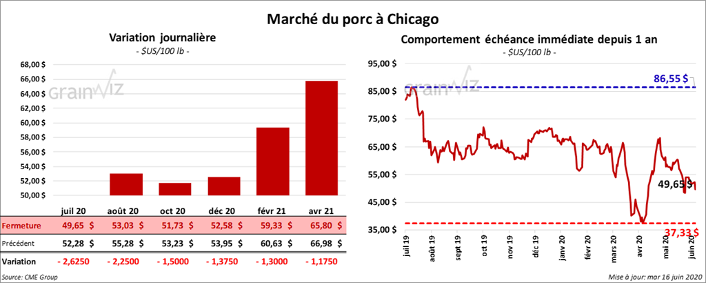 À la fermeture du marché, les contrats de porc US étaient en baisse de 1,17 $ à 2,62 $.