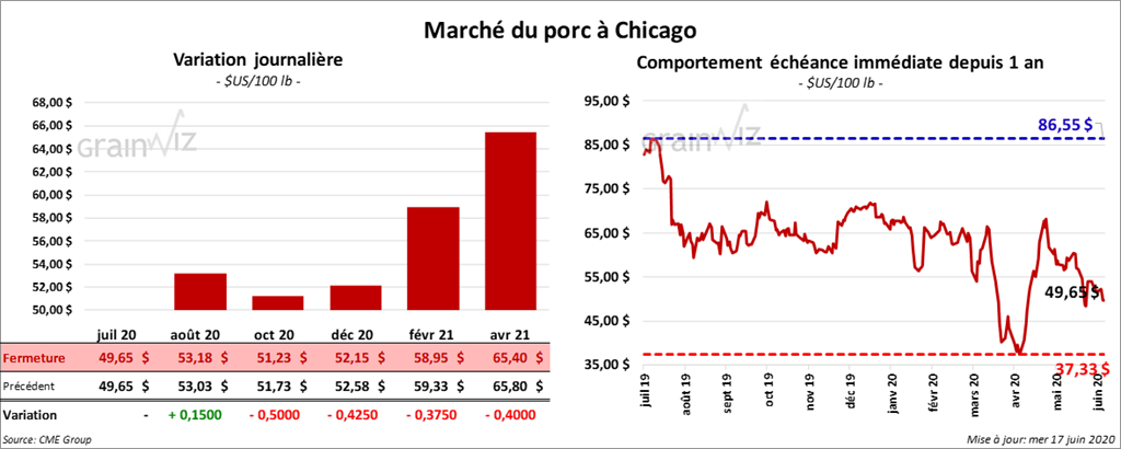 Les contrats de porc US ont terminé la journée sur une note partagée. Les contrats juillet 20 et août 20 ont fini la session au neutre et en hausse de 15 cents. Les contrats différés ont clôturé en baisse de 37 à 50 cents.