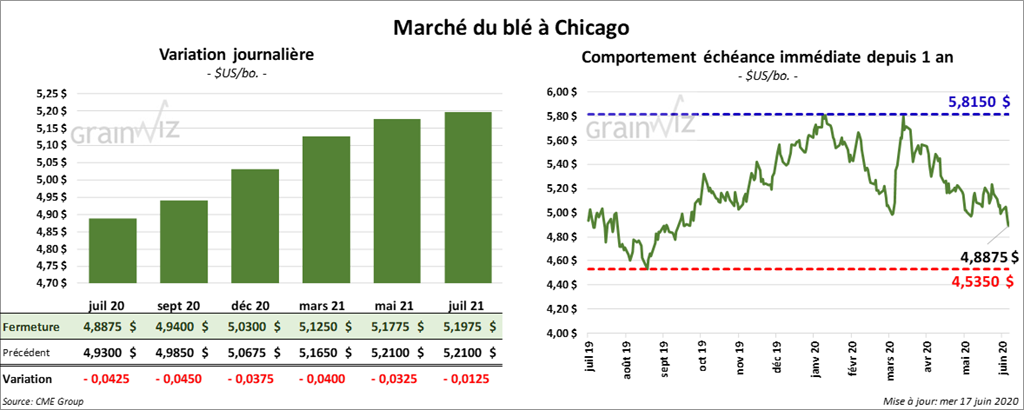 Les contrats de blé d’hiver US ont fini la session en baisse. Toutefois, ceux de blé de printemps US ont terminé en hausse. Les contrats de blé tendre rouge d’hiver ont donc clôturé en recul de 5 à 7 ¼ cents. Ceux de blé dur d’hiver aux échéances les plus rapprochées ont fini dans le rouge par 5 ¾ à 6 cents. À Minneapolis, les contrats de blé de printemps ont clôturé en hausse de 2 ¼ à 5 ¼ cents.