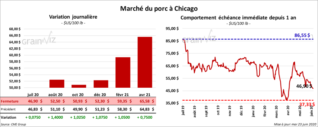 - Le 19 juin dernier, le CME Lean Hog Index était en baisse de 55 cents à 45,06 $.
