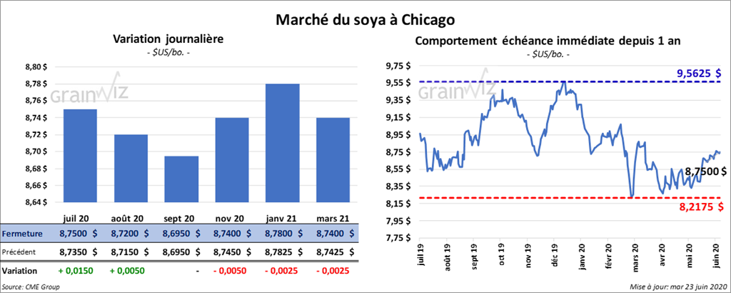 Les contrats de soya US ont fini la session en baisse de 1 ¼ à 5 ¼ cents, mais ceux aux échéances les plus rapprochées ont perdu 10 cents. Les contrats de tourteaux de soya ont clôturé en recul de 20 à 60 cents la tonne. Ceux d’huile de soya US ont terminé la journée en baisse de 18 points.