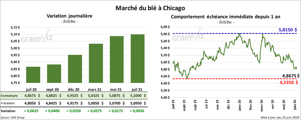 - Pour le rapport du 30 juin prochain, les analystes anticipent des stocks de blé US en baisse de 93 millions de boisseaux comparativement à la même période en 2019 à 987 millions de boisseaux.