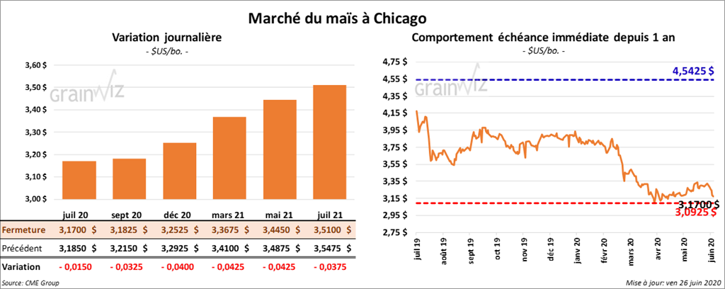 Les contrats de maïs US ont terminé la session en baisse de 0,4 à 0,85 %. Ceux de la nouvelle récolte ont reculé le plus en clôturant dans le rouge par 2 ½ et 2 ¾ cents.