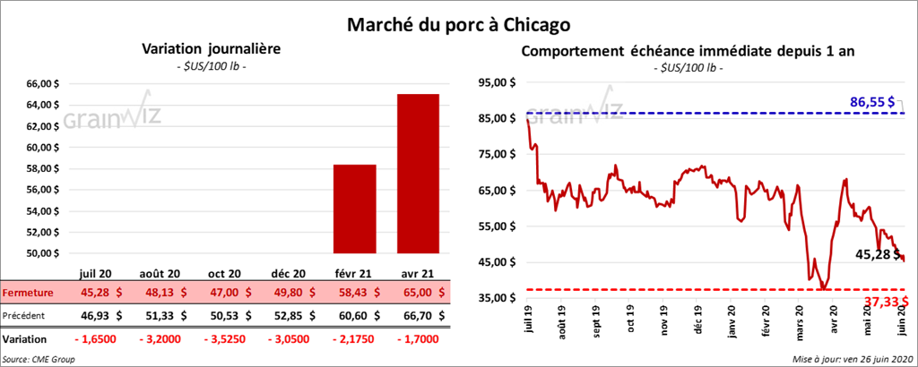 - Le 24 juin dernier, le CME Lean Hog Index était en baisse de 23 cents à 44,87 $.