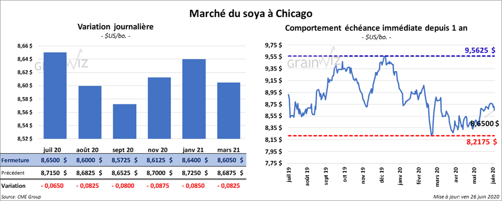 Le contrat de soya US juillet 20 a fini la journée en baisse de 4 ¼ cents. Les autres contrats aux échéances les plus rapprochées ont clôturé dans le rouge par 6 ½ à 7 ½ cents. Le contrat de tourteau de soya US juillet 20 a fini la session en recul de 3,40 $/tonne. Sur la semaine, il a perdu 5,10 $/tonne. Les contrats d’huile de soya US ont clôturé en baisse de 33 à 34 points.