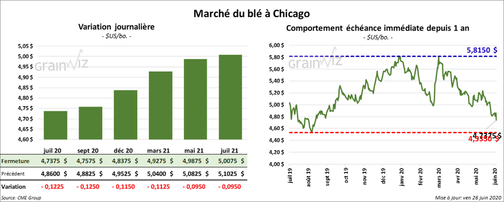À Chicago, les contrats de blé ont terminé en forte baisse de plus de 12 ¾ cents. Sur la semaine, le contrat de blé tendre d’hiver US juillet 20 a reculé de 1,6 %. À Kansas, les contrats de blé ont fermé dans le rouge par 8 ½ à 10 cents. Sur la semaine, le contrat de blé dur rouge d’hiver juillet 20 a reculé de 1,9 %. À Minneapolis, les contrats de blé ont terminé la journée en baisse de 6 ¼ à 12 ½ cents.