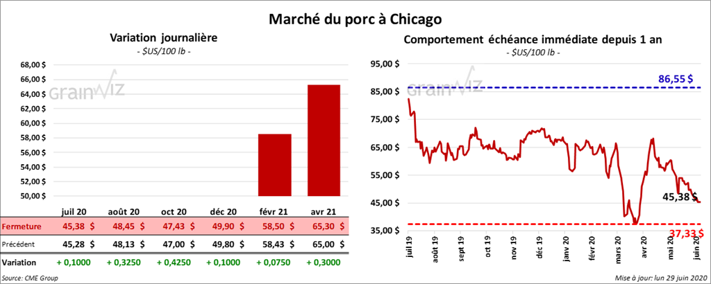 - Le 25 juin dernier, le CME Lean Hog Index a été en hausse de 36 cents à 45,23 $.