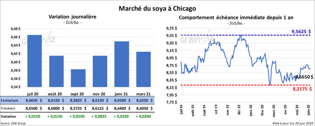 À La fermeture du marché, les contrats de soya US étaient en hausse. Ceux de l’ancienne récolte ont progressé le plus avec des gains de plus de 1 ½ cent. Les contrats de la nouvelle récolte ont également clôturé dans le vert d’une fraction à un cent. Les contrats de tourteau de soya US ont terminé la journée en baisse de 1,60 à 1,70 $/tonne. Ceux d’huile de soya US ont fermé à la hausse entre 37 à 42 points.