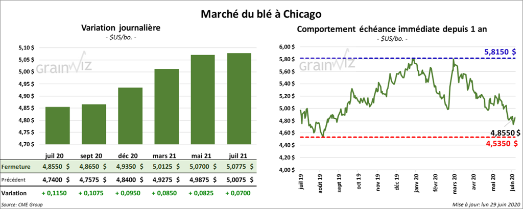 À l’exception du contrat de blé dur rouge de printemps juillet 20, qui a clôturé en baisse, les contrats de blé US ont terminé la session avec des gains. Ceux de blé tendre rouge d’hiver US ont progressé le plus. Les contrats de blé dur rouge d’hiver US ont fini dans le vert entre 7 ¼ à 8 ¾ cents. À Minneapolis, le contrat de blé dur rouge de printemps juillet 20 a terminé la journée dans le rouge par 1 ½ cent, mais les autres contrats aux échéances les plus rapprochées ont fini la séance en hausse entre ¾ et un cent.