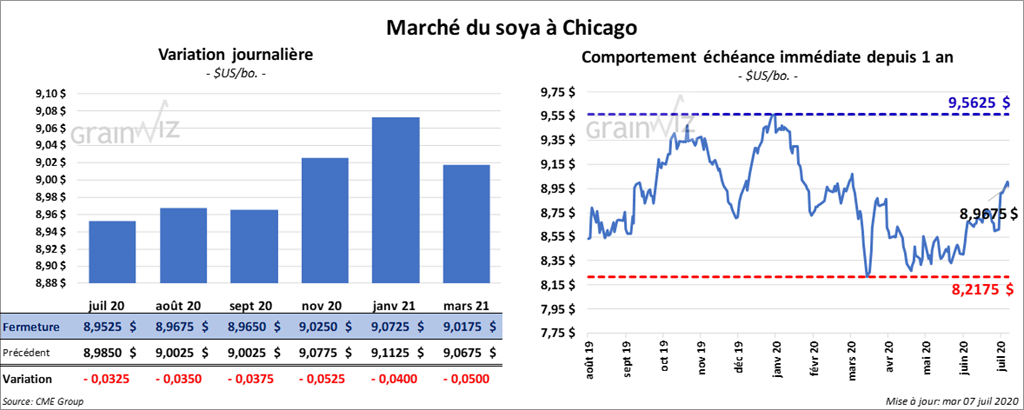 Les contrats de soya US aux échéances les plus rapprochées ont fini la session en baisse de 1 ¾ à 3 ¾ cents. Le contrat novembre 20 a reculé le plus. Le tourteau de soya US a également clôturé dans le rouge entre 2,10 $ et 2,50 $/tonne. Ceux d’huile de soya US ont fait l’inverse en terminant en hausse de 33 points.