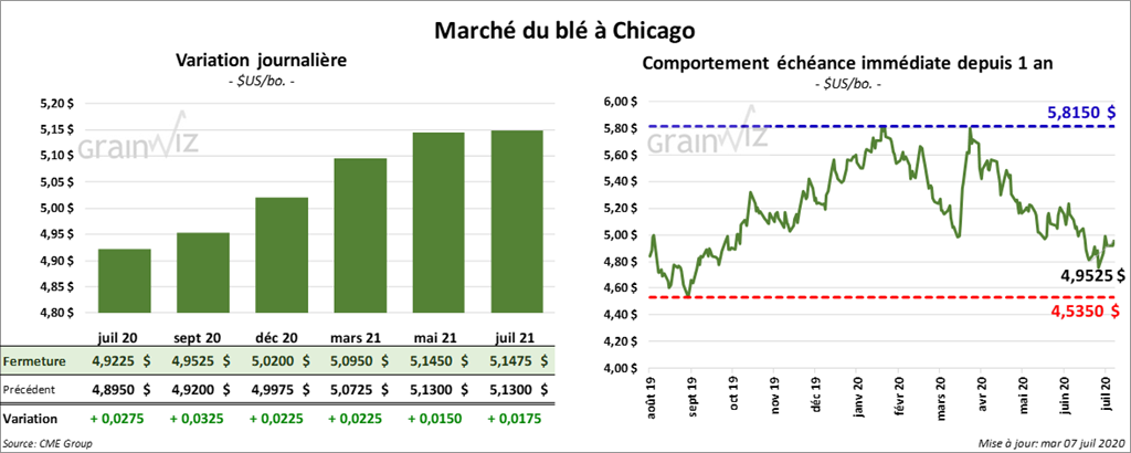 À la fermeture des marchés, les contrats de blé US étaient en hausse. À Chicago, le blé tendre rouge d’hiver a terminé en progression d’une fraction à 2 cents. Les contrats de blé dur rouge d’hiver US ont fini en hausse de plus de 3 ¼ cents. À Minneapolis, les contrats de blé de printemps ont fermé avec des gains entre ¼ et 2 ¼ cents.