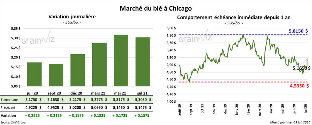 Les contrats de blé US ont clôturé en hausse par 2 chiffres. Ceux de blé d’hiver ont été plus fermes. À Chicago, le blé tendre rouge d’hiver a fermé dans le vert entre 17 ¼ et 25 ¼ cents. Les contrats de blé dur rouge d’hiver ont fini en progression de 13 ¾ à 16 cents. Ceux de blé dur rouge de printemps ont terminé la journée en hausse de 9 ½ à 10 ¾ cents.