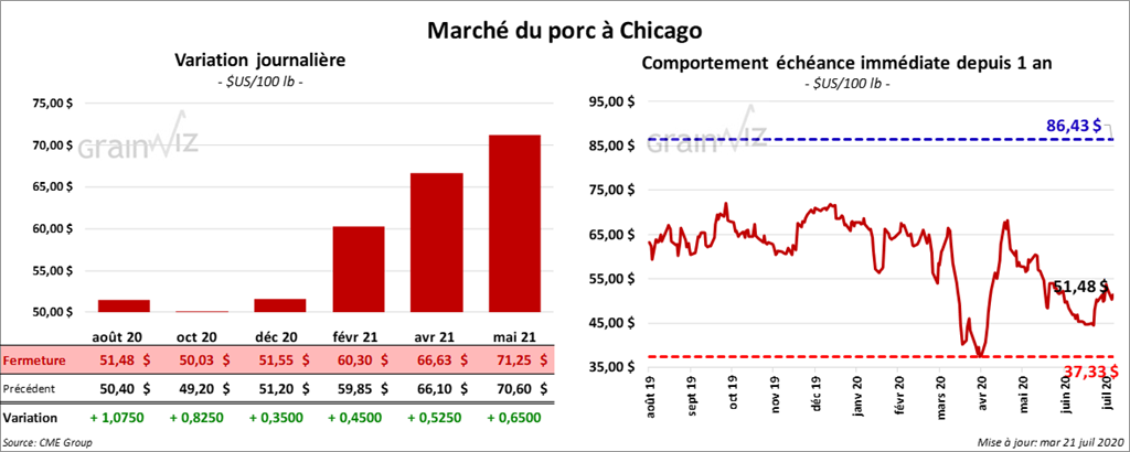 Les contrats de porc US ont fini la journée avec des gains de 35 cents à 1,07 $. Celui août 20 a progressé le plus.