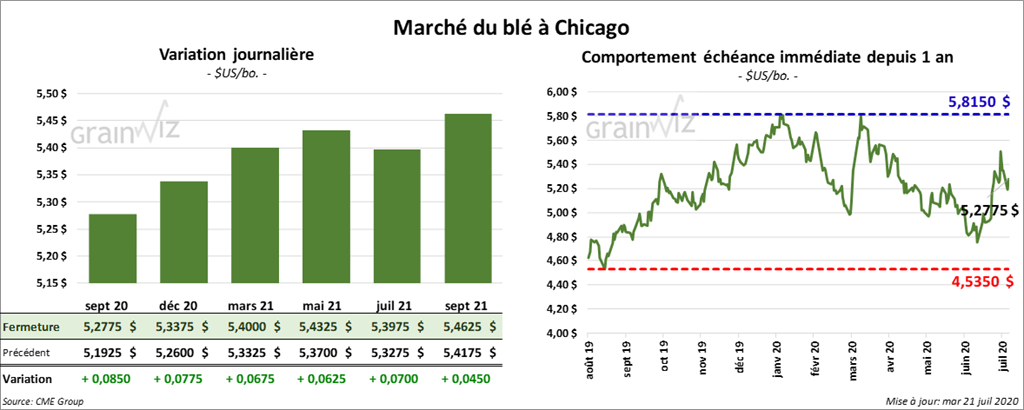 Les contrats de blé US ont fermé la session en hausse. À Kansas, ceux de blé dur rouge d’hiver ont fini la journée avec des gains de 7 à 7 ½ cents. À Chicago, les contrats de blé tendre rouge d’hiver ont clôturé en progression de 4 ½ à 5 ¾ cents. Ceux de blé de printemps US ont également terminé la journée dans le vert par 2 ¾ à 4 cents.