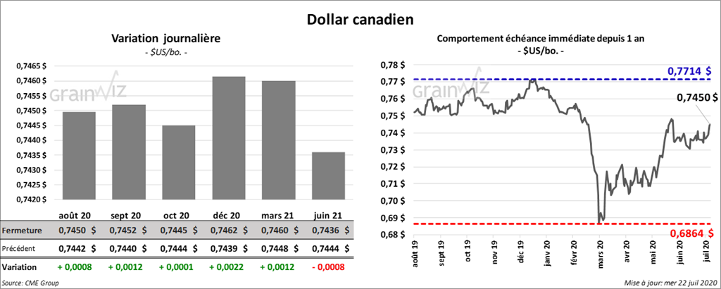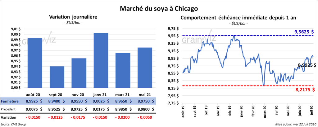 Les contrats de soya US aux échéances les plus rapprochées ont fini la journée avec des gains de 1 ½ à 3 cents. Ceux de tourteau de soya US ont également clôturé dans le vert entre 90 cents et 1,00 $/tonne. Par contre, l’huile de soya a terminé la session en baisse de 14 points.