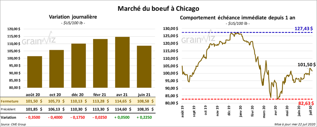 - Le 21 juillet dernier, le CME Feeder Cattle Index était en baisse de 2 cents à 136,42 $.