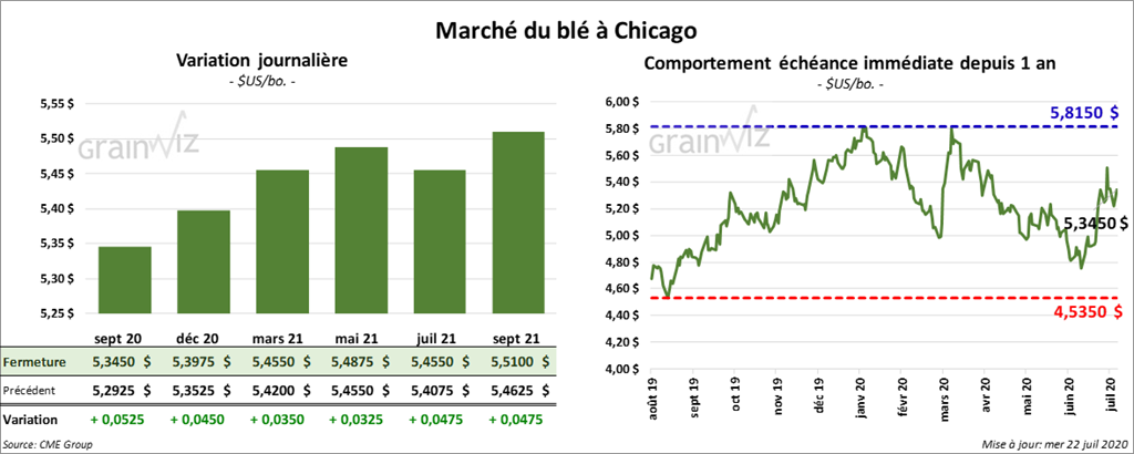 Les contrats de blé US aux échéances les plus rapprochées ont terminé la session en hausse. À Chicago, les contrats de blé tendre rouge d’hiver aux échéances les plus rapprochées ont progressé entre 1,01 % et 1,28 %. À Kansas, le blé d’hiver a clôturé avec des gains entre 5 et 6 cents. Les contrats de blé dur rouge de printemps ont fini à la hausse entre 2 ½ à 4 ¼ cents.