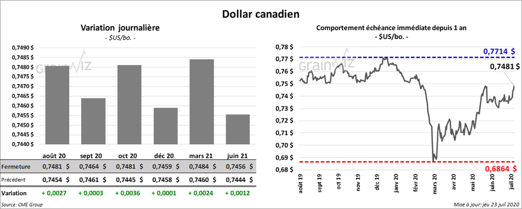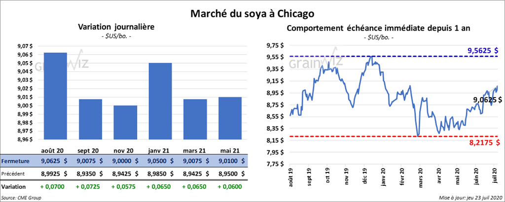 Les contrats de soya US ont principalement terminé la journée en hausse. Ceux aux échéances les plus rapprochées ont gagné plus de 7 cents au cours de la session. Par contre, les gains étaient limités à seulement 3 cents pour les contrats différés. Les contrats de tourteau de soya US ont également clôturé dans le vert par 3,80 $/tonne. Quant à ceux de l’huile de soya US, ils ont fini la journée en baisse de 14 à 16 points.