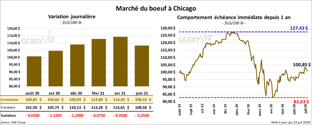 Les contrats de bœuf US ont fini la session dans le rouge entre 35 cents et 1,12 $. Ceux de veau US ont également terminé la journée en baisse. Par contre, le contrat août 20 a clôturé en hausse de 5 cents.