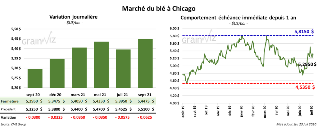Les contrats de blé US ont terminé la session en baisse. À Kansas, ceux de blé dur rouge d’hiver ont reculé davantage pour finir avec des pertes de plus de 7 ¼ cents. Les contrats de blé tendre rouge d’hiver ont clôturé en baisse de 0,92 % à 1,1 %. À Minneapolis, les contrats de blé ont terminé la session dans le rouge entre 3 ¾ à 4 ¾ cents.