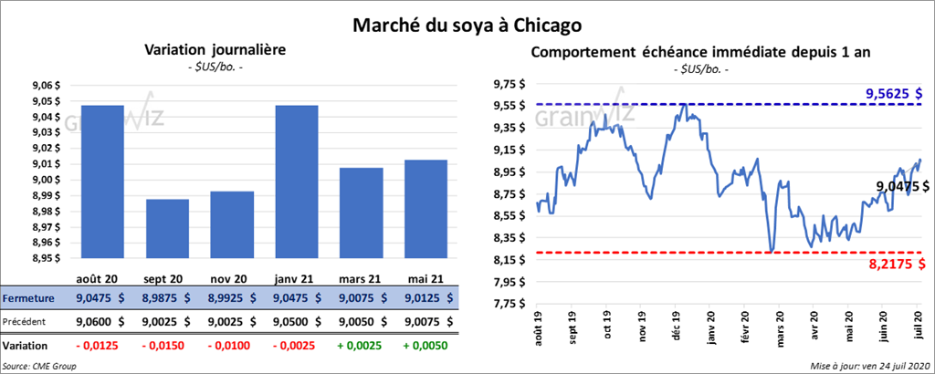 Les contrats de soya US ont fini la journée en baisse. Ceux différés étaient en recul d’une fraction de cent. Le contrat août 20 a perdu 1 ½ cent. Les contrats de tourteau de soya US ont terminé la session en hausse de 40 cents/tonne. Ceux d’huile de soya ont clôturé sur une note partagée.