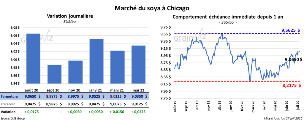 Les contrats de soya US ont fini la journée en hausse d’une fraction à 2 ¾ cents. Ceux de tourteau de soya US aux échéances les plus rapprochées ont aussi clôturé dans le vert par plus de 1,70 $/tonne. Les contrats d’huile de soya US ont fait l’inverse en terminant en baisse de 20 à 21 points.