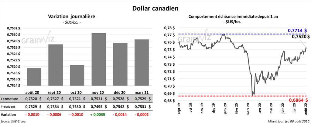 Les contrats de soya US ont terminé la journée dans le rouge par ¼ et 1 ½ cents. Ceux août 20 et septembre 20 ont encaissé les plus fortes pertes. Les contrats de tourteau de soya US aux échéances les plus rapprochées ont fini la séance en baisse de 1,50 $ à 1,60 $/tonne. Le contrat d’huile de soya US août 20 a clôturé dans le rouge, mais ceux septembre 20 et octobre 20 ont terminé en hausse.
