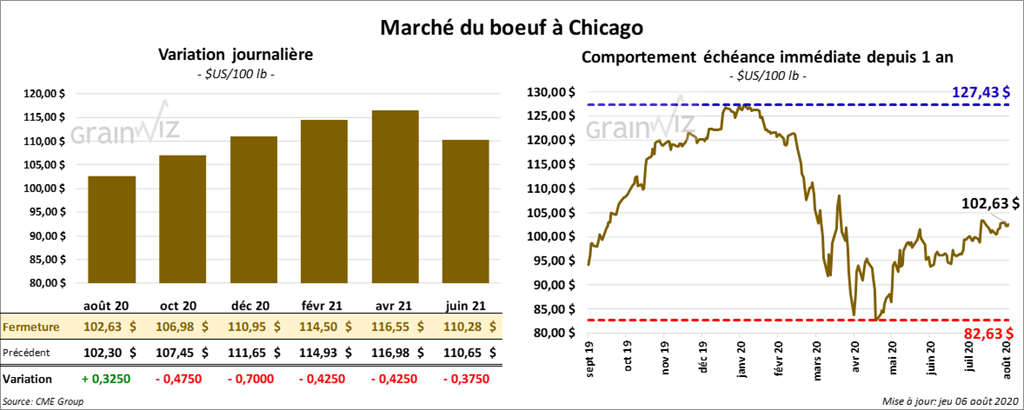 Les contrats de bœuf US ont principalement terminé la session avec des pertes limitées à 70 cents. Par contre, celui août 20 a fini avec un gain de 32 cents. Les contrats de veau US aux échéances les plus rapprochées ont terminé la journée en baisse entre 52 cents et 1,32 $.
