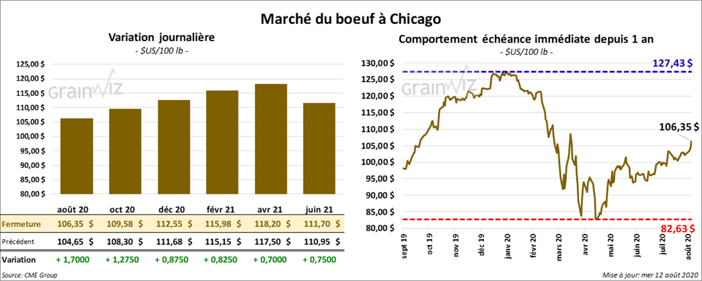 - Le 11 août dernier, le CME Feeder Cattle Index était en hausse de 20 cents à 142,62 $.