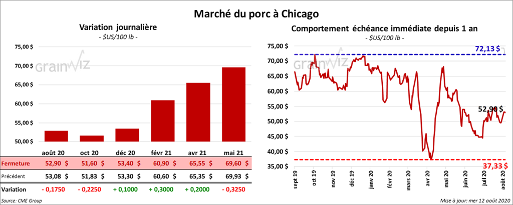 - Le 10 août dernier, le CME Lean Hog Index était en hausse de 78 cents à 53,79 $.