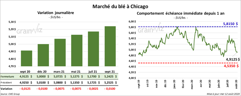 La plupart des contrats de blé US ont fini la séance en baisse. Les contrats de blé tendre rouge d’hiver US ont reculé le plus avec des pertes de 3 à 3 ¾ cents. À Kansas, à la fermeture, les contrats de blé étaient en progression partagée sur une fraction de cent. À Minneapolis, les contrats de blé dur rouge de printemps ont terminé en recul de ½ à 2 ½ cents.