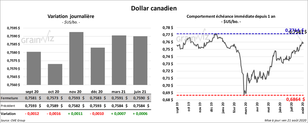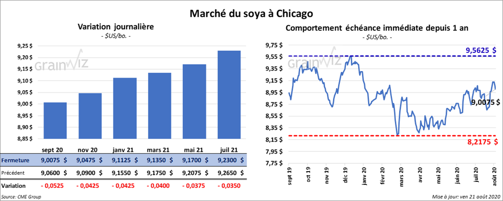 - Ce matin, l’USDA a annoncé deux ventes privées à l’exportation de soya US. La première, de 400,000 tonnes, qui est de la nouvelle récolte, est destinée à la Chine. La deuxième, de 368,000 tonnes, concerne des destinations inconnues pour des livraisons en 2020/2021.