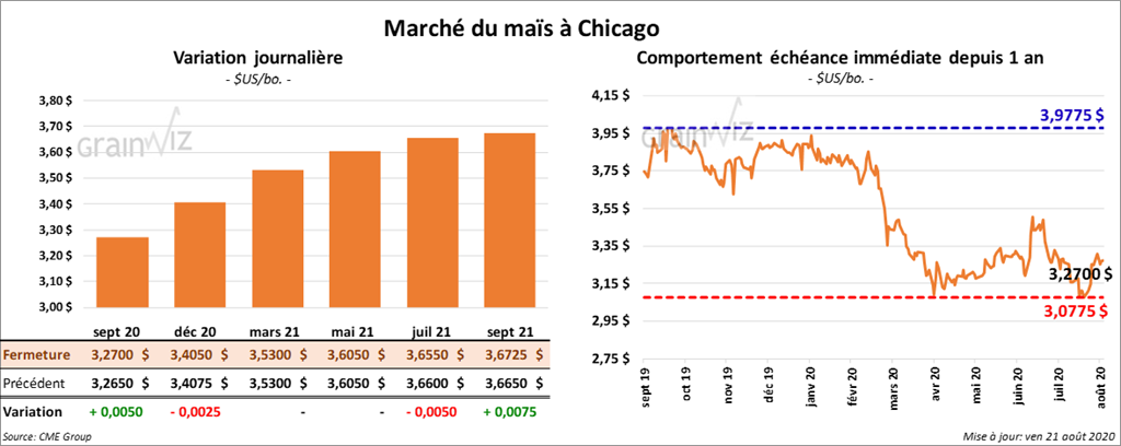 Les contrats de maïs US septembre 20 et décembre 20 ont tous deux terminé la journée en hausse respective de 2 ½ et 1 ¼ cents. Par contre, les autres contrats ont fini sur une note partagée.