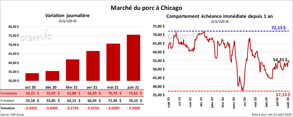 - Le 19 août dernier, le CME Lean Hog Index était en hausse de 33 cents à 55,41 $.