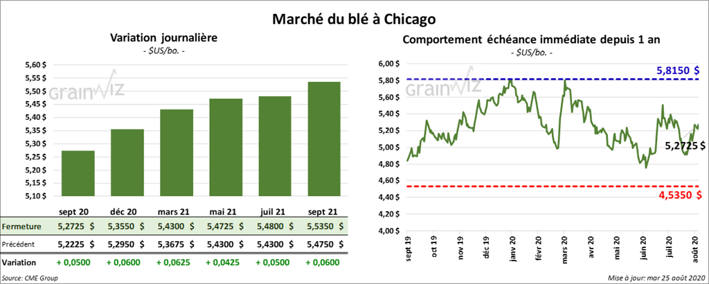 Les contrats de blé US ont fini la journée dans le vert. À Chicago, ceux de blé tendre rouge d’hiver ont terminé avec des gains entre 6 ¼ et 7 ¾ cents. À Kansas, les contrats de blé aux échéances les plus rapprochées ont clôturé en hausse de 9 à 9 ¾ cents. À Minneapolis, ils ont fini la session en progression de 8 ¾ à 11 cents.