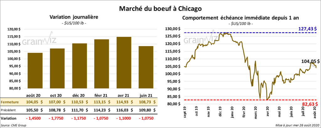 - Le 25 août dernier, le CME Feeder Cattle Index était en baisse de 2 cents à 143,60 $.