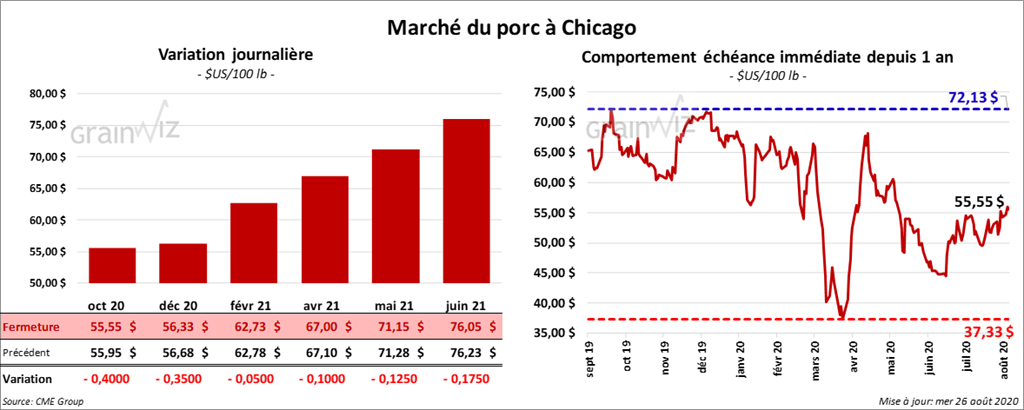 - Le 24 août dernier, le CME Lean Hog Index était en hausse de 54 cents à 56,60 $.