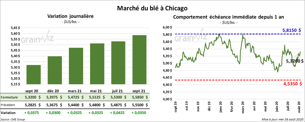 Les contrats de blé US ont fini la session en hausse. À Chicago, les contrats de blé aux échéances les plus rapprochées ont fermé avec des gains entre 4 et 5 cents. À Kansas, les contrats de blé ont clôturé dans le vert entre 5 ½ et 6 cents. À Minneapolis, ceux de blé dur rouge de printemps ont terminé la journée en hausse d’une fraction à 2 ¾ cents.
