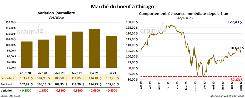 À l’exception du contrat août 20 qui a terminé la séance avec un gain de 25 cents, les contrats de bœuf US aux échéances les plus rapprochées ont clôturé en baisse de 65 cents à 1,25 $. Les contrats de veau US ont également fini dans le rouge entre 97 cents et 1,30 $. Sur la semaine, celui septembre 20 a perdu 4,82 $.