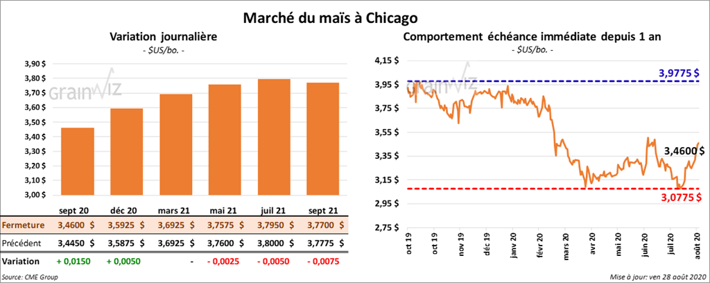 Les contrats de maïs US septembre 20 et décembre 20 ont terminé en hausse respective de 1 ¾ et ¾ cents. Par contre, les contrats différés ont clôturé en baisse de plus d’un cent.